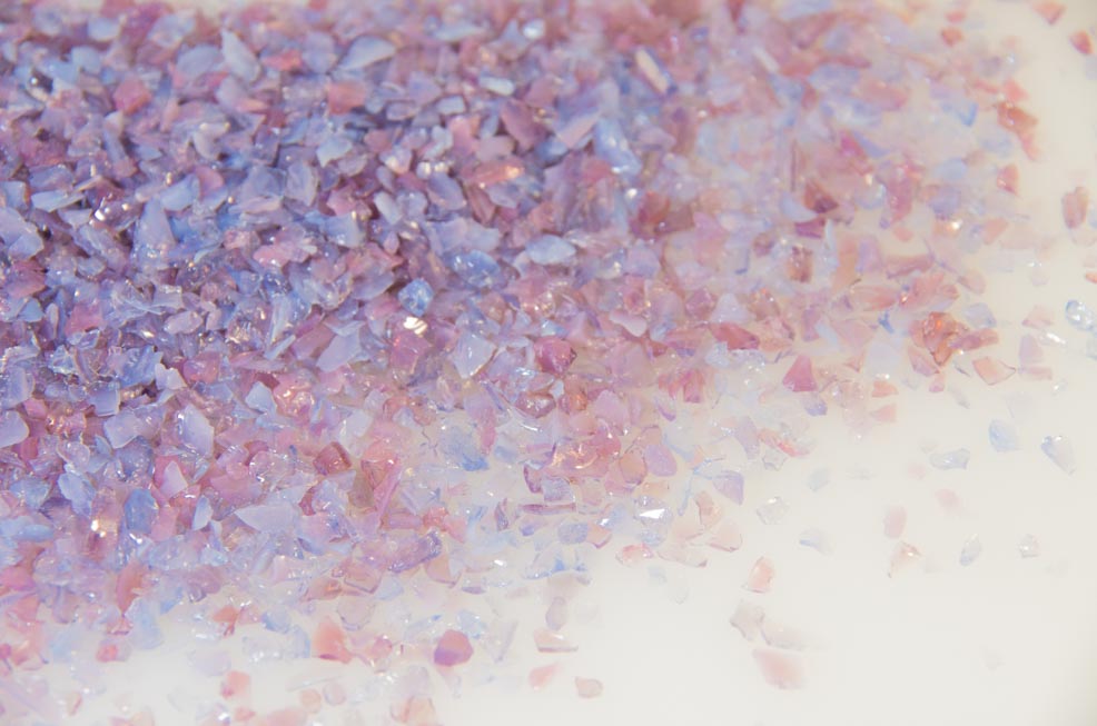 オパールセント加工のされた、封入用の不透明~半透明ガラスカレットです。