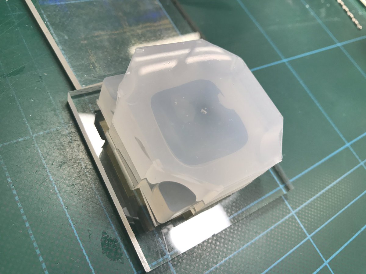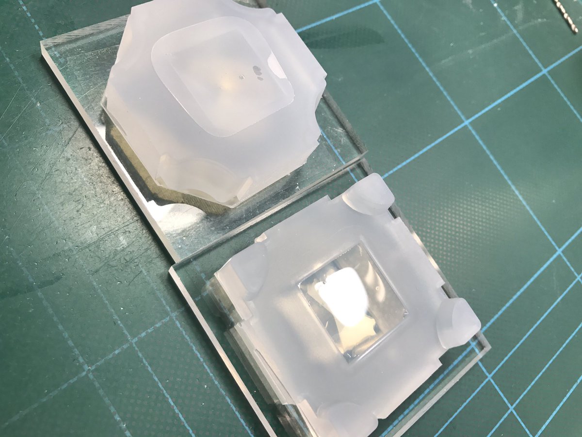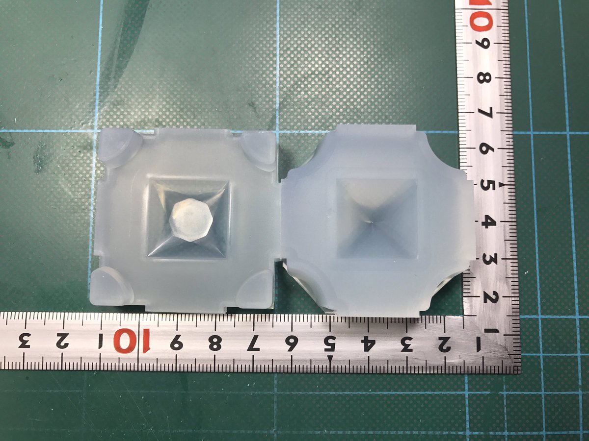 最初に片方のモールドにレジンを流し、固めてからもう一方のモールドにレジンを流し
