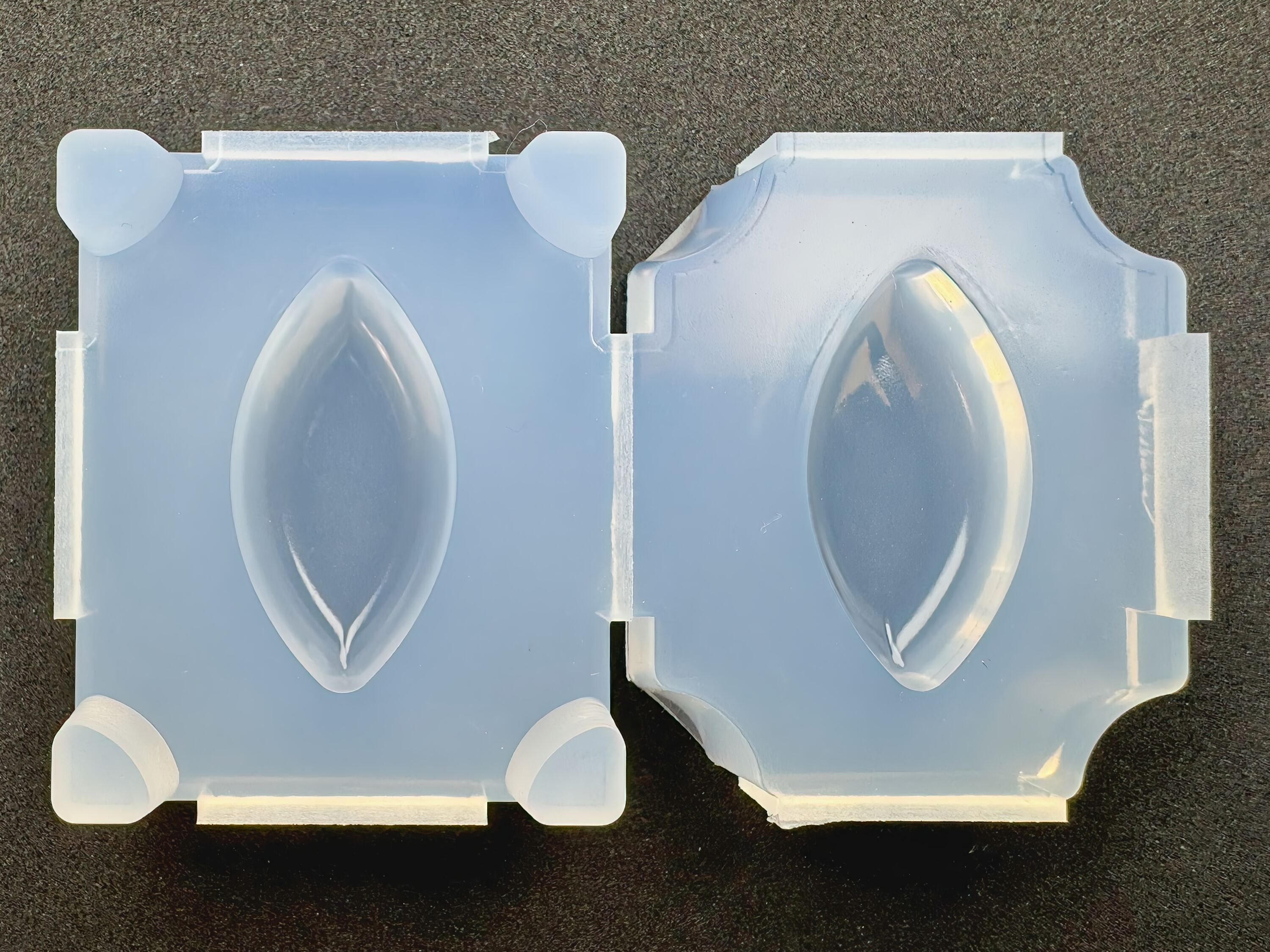 レジンが液体であると言うことで、片方は予め硬化させてから貼り合わせる必要がございます。