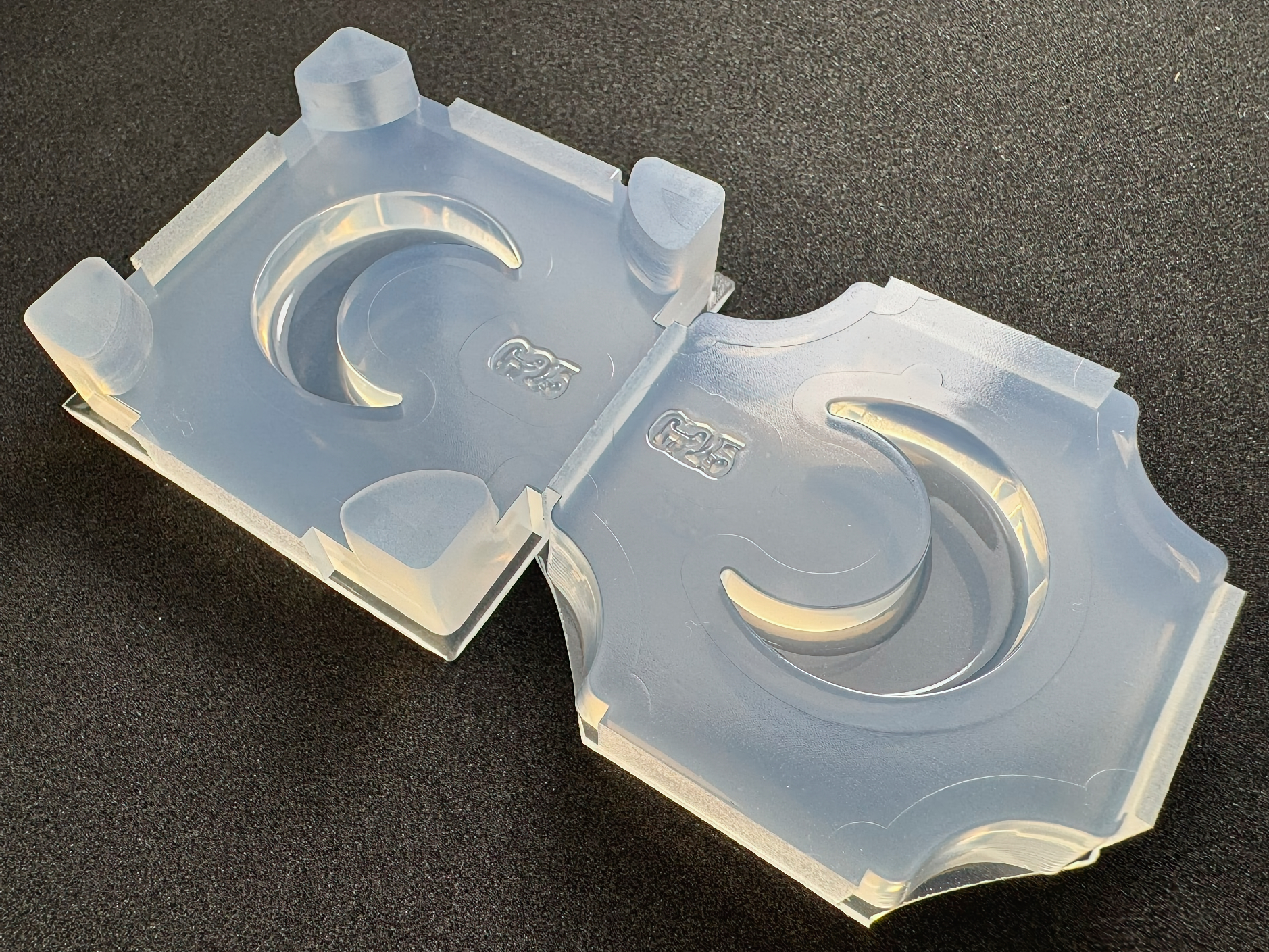 最初に片方のモールドにレジンを流し、固めてからもう一方のモールドにレジンを流し